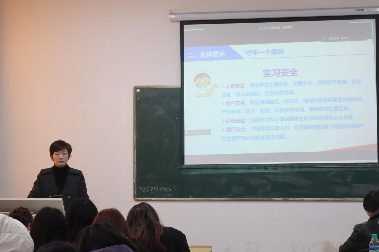 最后,陈敏做总结讲话,强调了实习的重要性和意义,并叮嘱同学们在实习期间要注意安全,着重强调人身安全、财产安全、心理安全、医疗安全等相关安全事宜;要遵守规则,严守学校和医院相关规章制度。同时,她重点强调了实习与就业的关系,希望大家以高质量实习提升就业技能,更顺利地过渡到工作岗位,嘱托同学们能够珍惜此次难得的学习和锻炼机会,不断提升自己的专业素养和实践能力,为未来的职业生涯做好充分准备。